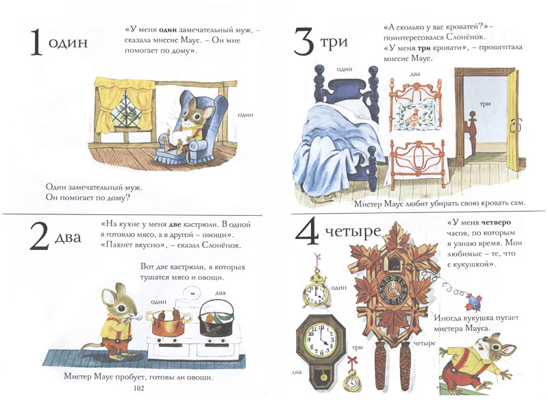 Собранные в книге сюжеты можно условно разделить на три группы. Первая из них – это своеобразный «иллюстрированный словарь». На таких разворотах представлены тематические комплексы предметов: десятки рисунков с подписями. Вот дом семьи кроликов, подписаны все комнаты и предметы мебели. На развороте «Музыканты» размещены музыкальные инструменты. И таких разворотов десятки: аэропорт, ферма, одежда, игрушки, поезда, профессии… Коротенькие вступительные тексты заканчиваются небольшим заданием-загадкой, которая делает рассматривание картинок еще интереснее: какой цветок ты любишь? Кем ты хочешь стать? Важно и то, что перед нами – не иллюстрированный каталог товаров. Почти все предметы показаны в момент их использования: на рисунке плотник пилит доску – и подписи подсказывают: «плотник», «пила», «доска»