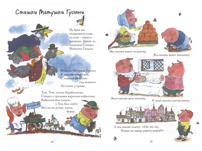 Третий тип материалов – сказки и стихи. Большинство из них входит в фольклорный английский сборник «Стишки матушки Гусыни». Остальные созданы Патрицией Скарри, писательницей, женой автора книги. Эти обучающие тексты с рисунками посвящены временам года, цветам, походке животных.