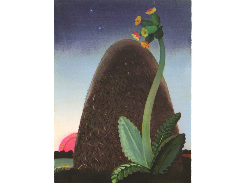 Но усы жужелицы выглядят как поводья фантастического коня, ножки кончаются изящными черненькими точками-копытцами, а муравьишка – этакий лихой всадник-путешественник. Полевые колоски и цветы-колокольчики сказочно несоразмерны заходящему солнцу, напоминающему волшебный колобок.