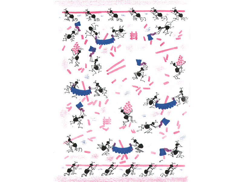 А как представлен муравейник «изнутри», после заката? Мы видим множество маленьких кроваток, и на каждой из них спит муравьишка. Не муравей, а именно муравьишка, укрытый одеяльцем. Между кроватками расставлены крохотные разноцветные ночные горшочки. Такой муравьиный детский сад…