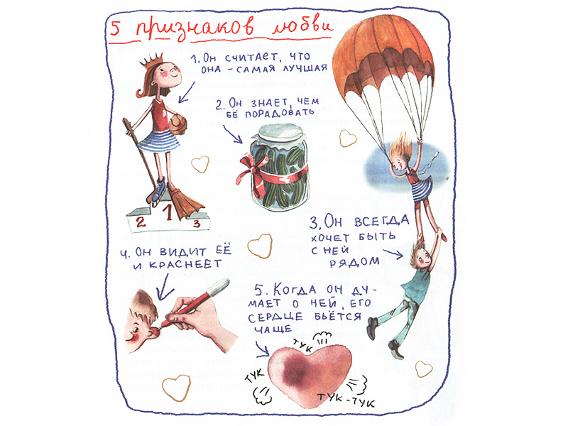 Для младших школьников любовь – это, с одной стороны, нечто крайне противное, «сюси-пуси»: «Когда влюбляешься, надо целоваться. В губы». – «Фу-у-у-у!!! Там же СЛЮНИ!!!» Одним словом, любовь ‒ это ерунда. Но с другой стороны, это дело престижа: Женины одноклассники заранее делают ставки, кто получит «валентинки», а кто нет, и никому не хочется остаться без заветной записочки.