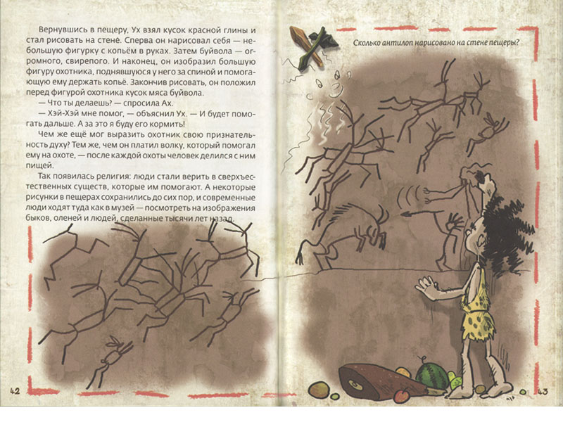 В отличие от многих современных исторических книг, здесь нет никаких «путешественников во времени» – никто не прилетел в первобытную семью на неком чудо-транспорте, никто не смотрит на древний мир «с современной стороны». Совсем наоборот: эволюционная логика авторов требует, чтобы мы проследили первобытную историю как бы «изнутри», вживаясь и вслушиваясь в проблемы, которые волновали людей того времени. Конечно, и эта логика требует некоторых условностей: например, тысячелетняя история человечества показана как жизнь одной семьи, члены которой не растут и не стареют, проживая целую эпоху за несколько лет. Эта семья совершает важнейшие открытия: они приручают огонь, осваивают земледелие, придумывают религию.