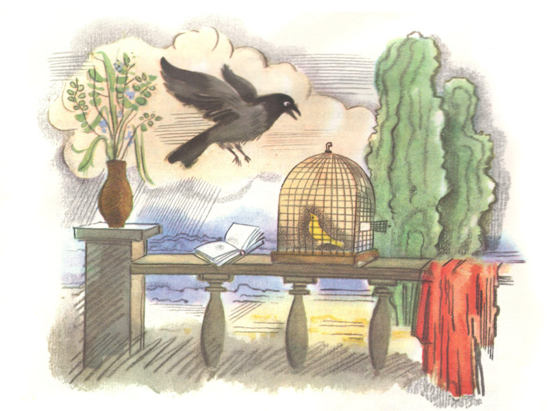 «Зажила опять Канарейка в вороньем гнезде и больше не жаловалась на голод и холод. Раз Ворона улетела на добычу, заночевала в поле, а вернулась домой, – лежит Канарейка в гнезде ножками вверх. Сделала Ворона голову набок, посмотрела и сказала: