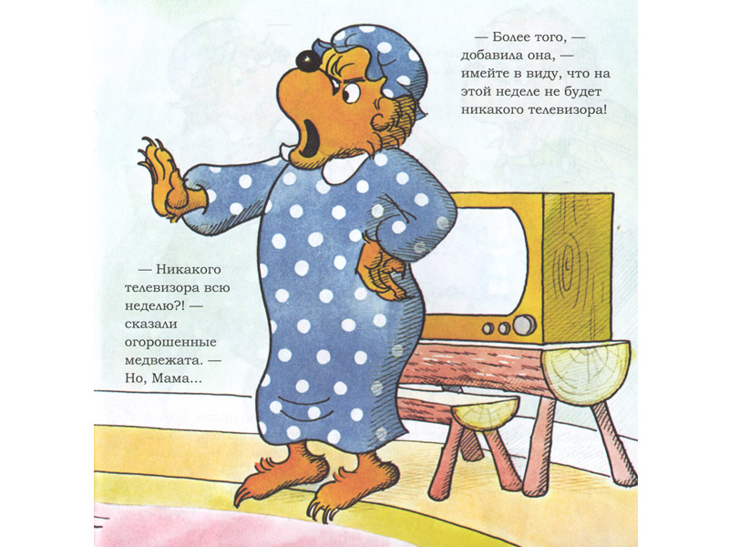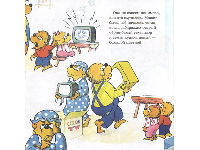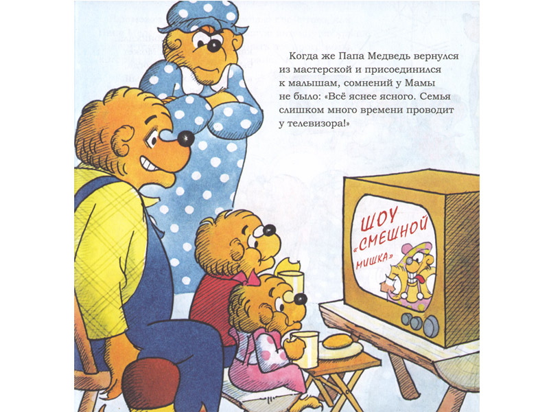 Семья беренстейновских медвежат живет в Доме-на-Дереве в Медвежьей стране. В историях из жизни Брата, Сестры, Папы и Мамы легко узнаваемы события, происходящие почти в любой семье: дети идут в школу, впервые едут в лагерь, учатся говорить правду и побеждать свои дурные привычки, узнают смысл денег и борются со страхами. Поэтому появление в этом ряду специальной книги, посвященной зависимости медвежат от просмотра телепередач, вполне оправдано – для многих детей старшего дошкольного и младшего школьного возраста эта проблема очень актуальна.