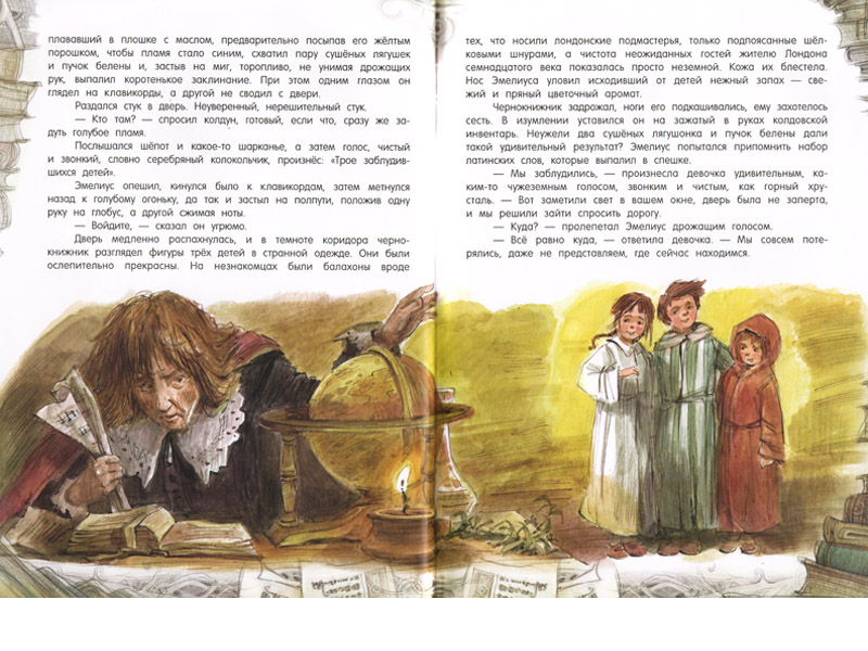 Еще нужно сказать об иллюстрациях и оформлении в целом. Обложка – как дверь в волшебную комнату, с объемной вырубкой и окошками, ‒ в буквальном смысле затягивающая внутрь. Картинки Вадима Челака – динамичные и выразительные. Специфически английского в них практически нет (и такой задачи, видимо, не было), зато много «общесказочного»: «Жили-были трое детей…». И, конечно, очень важны «говорящие» лица персонажей, по которым легко «читается» характер и реакции персонажей на происходящее.