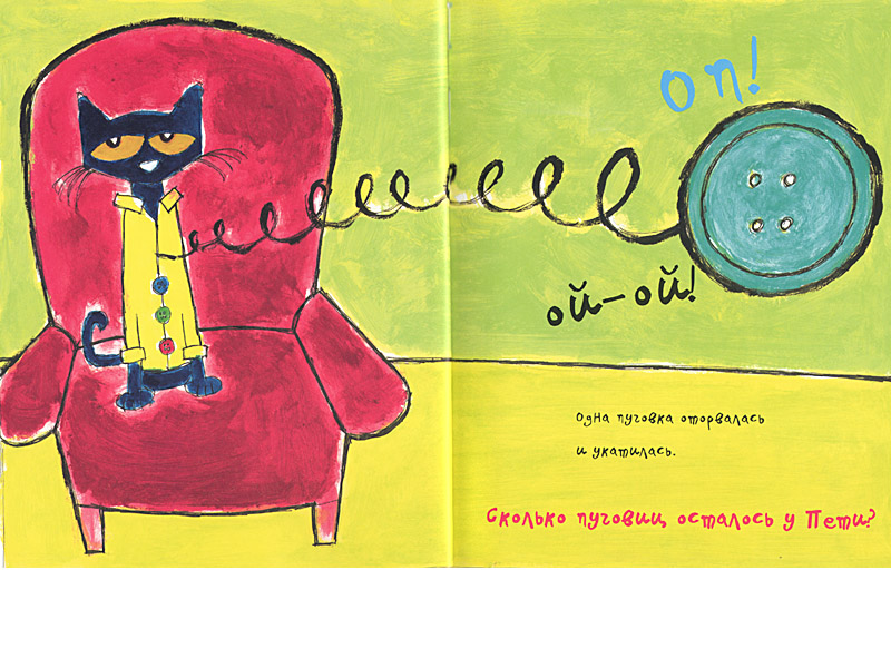 В 8 часов утра котик Петенька надел свою любимую рубашку с четырьмя большими разноцветными пуговицами. Художник Джеймс Дин часы со стрелками нарисовал крупно – специально для того, чтобы читающий вслух родитель обратил на них внимание ребенка. Пуговиц на рубашке Петеньки действительно четыре, на иллюстрации присутствует и соответствующая цифра. Само слово «четыре» тоже есть: повторяется несколько раз и выделено в тексте цветом. И пуговицы действительно разноцветные. Это важно, и ребенку стоит внимательно разглядеть и запомнить цвета этих пуговиц.
