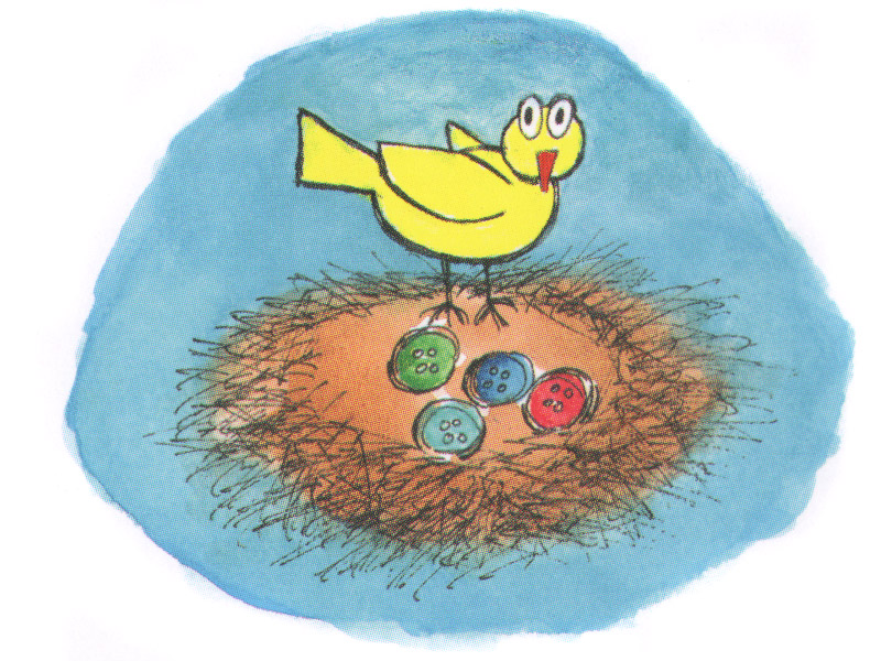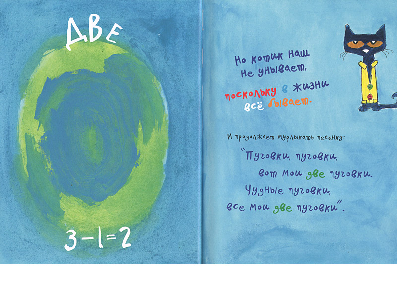 Дальше пуговицы начинают медленно отваливаться – одна за другой. Цифры последовательно уменьшаются, и к изображениям цифр на страницах добавляются записи математических выражений (примеров): 4 ‒ 1 = 3, 1 ‒ 1 = 0. Меняются и слова песенки: «Пуговки, пуговки, все четыре пуговки… вот мои три пуговки… вот мои две пуговки… пуговка моя».