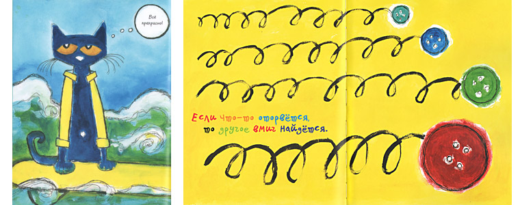Причина, по которой отваливаются разноцветные пуговки, неизвестна (да и впрямь, кто знает, почему они все время отрываются, эти пуговицы?) ‒ и совершенно неважна. Гораздо важнее, как Петенька реагирует на пропажу любимых аксессуаров. Четыре раза авторы повторяют одно и то же: «Но котик наш не унывает, поскольку в жизни все бывает». Вся книга построена на повторах, и этот прием точно соответствует особенностям восприятия маленьких детей.