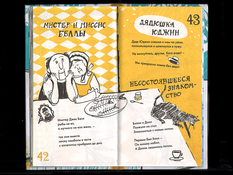 – Разница есть, и мы сразу об этом задумались, когда начинали работать над книгой. Я сама люблю все изданные книги Вадима Александровича, каждая из них со своим характером. Кстати, есть еще очень хорошая книга «Между нами», а есть сборник стихов и сказок, причем сказки выходили только в одном или двух сборниках, если я не ошибаюсь. Но у новой книжки есть много преимуществ. Во-первых, в ней около 70 стихотворений. А это намного больше, чем в «Глупой лошади», выходившей в разных издательствах. «Глупая лошадь» – как раз детская книга. Хотя я настаиваю, что левинские стихи – вневозрастные. А «Стихи с горчицей» – книга семейная. И оформлена она хоть и пестровато, но не для детей. Это просто иллюстрированный сборник поэзии. Другое дело – нравится вам такая графика или нет. Художники других книг серии обошлись со сборниками более деликатно. Зинаида Сурова, Надежда Суворова, Анна Флоренская, Татьяна Кормер – художники-лирики. У них здорово получается работать и над прозой, и над стихами. Их графика лирична, как сами стихи. Мои иллюстрации немного выбиваются из этой стройности, но я сделала это намеренно. Как эксперимент. Мне очень захотелось создать к каждому развороту свой индивидуальный мирок, показать каждого персонажа. Насытить пространство портретами.