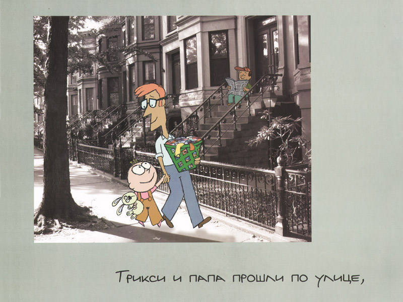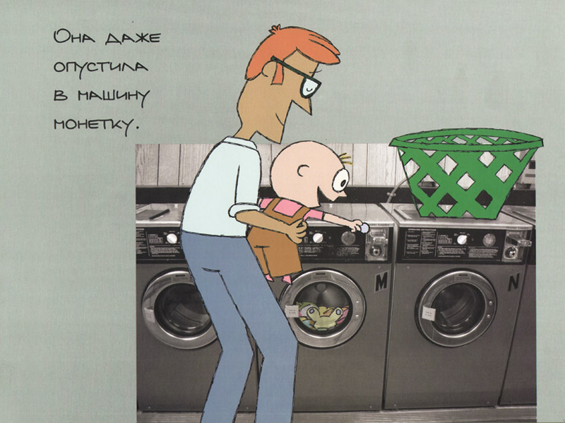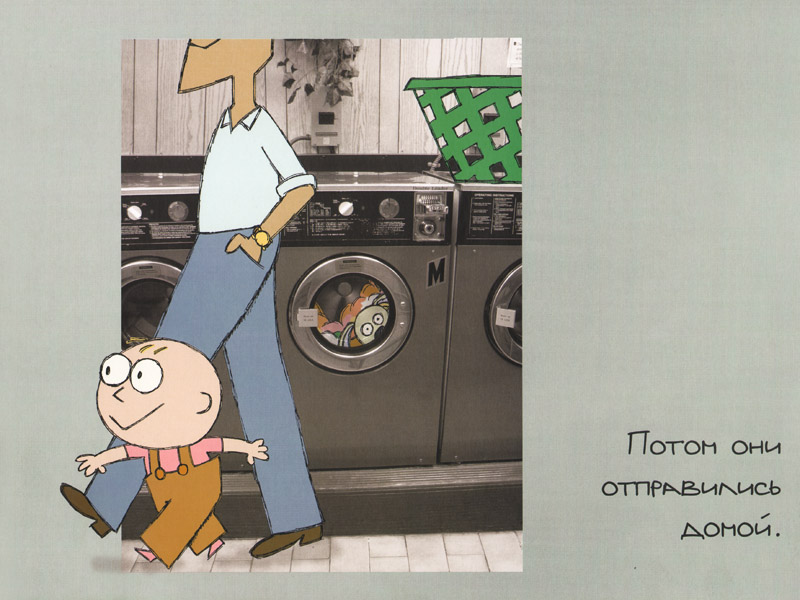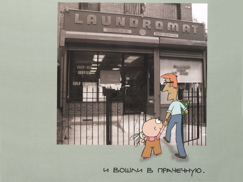 А вот Лёня высоко оценил визуальное решение книги. Он сразу обратил внимание, что здесь смонтированы «реальные» фотографии и нарисованные образы. Пока мы с Платоном обсуждали проблемы произношения, он перелистал всю книгу, прочел английские надписи на фотографиях и обнаружил на последней странице благодарность автора бруклинской прачечной.