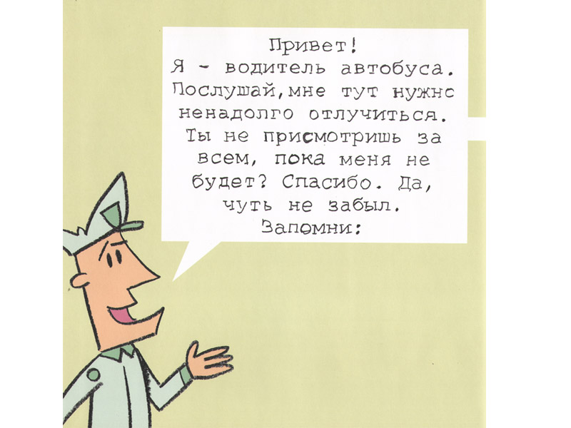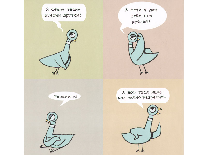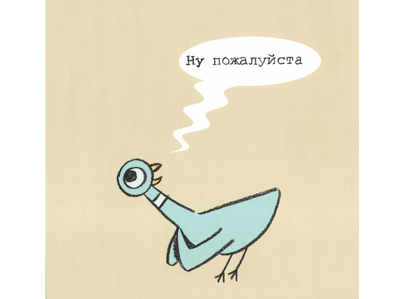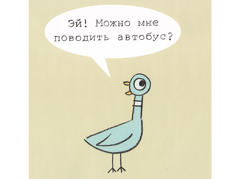 «Читать» книжку-картинку «Не давай голубю водить автобус!» традиционным способом вряд ли получится. В ней три персонажа. Водитель автобуса произносит две фразы в самом начале (они даже напечатаны на форзаце книги), затем уходит (в прямом смысле – делает шаг за границу книги) и появляется лишь в конце, чтобы произнести еще несколько фраз. Второй персонаж вообще не говорит ни слова; он существует «за страницами» книги (собственно, это просто читатель), и именно его водитель автобуса просит присмотреть за тем, чтобы во время его отсутствия всё было в порядке. Главная просьба формулируется просто: не давай голубю водить автобус. Ну а третий персонаж – сам голубь, который на протяжении всей книги упрашивает «застраничного» героя дать ему возможность поводить этот самый автобус. На каждой странице напечатаны одна или несколько реплик голубя, обращенные к «заместителю» водителя.