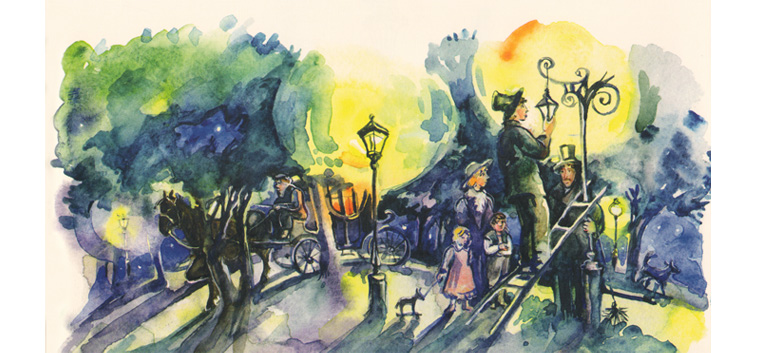 А помогли фонарщику дети. На чердаках и в подвалах они нашли старые фонари и развесили их на деревьях в парке. И в этом преобразившемся, как будто волшебном парке вдруг появились шарманщик, трубочист, извозчик из других сказок.