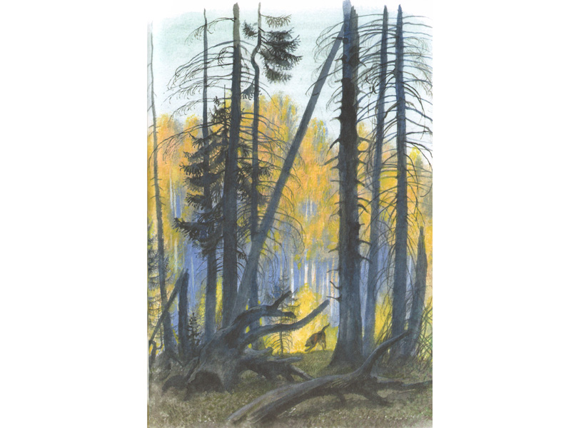 Время от времени смотрю на ребят ‒ все ли слова им понятны? Это по глазам обычно заметно, даже если кто-то и не решается спросить. Попадается несколько трудных слов из охотничьего и северного лексикона, и я коротко объясняю их по ходу чтения ‒ но главными сейчас мне кажутся не подробности охотничьего ремесла, а внимательное наблюдение за тем, как слепой пес принимает вызовы жизни, как он воспринимает мир, не видя его глазами. В этом очень помогает не только живописная манера письма Юрия Казакова, но и иллюстрации Николая Устинова. Дети откликаются, начинают тоже рисовать то, о чем слышат, и в результате возникает целая серия собачьих портретов и жанровых зарисовок.