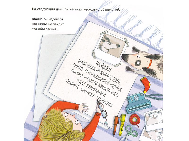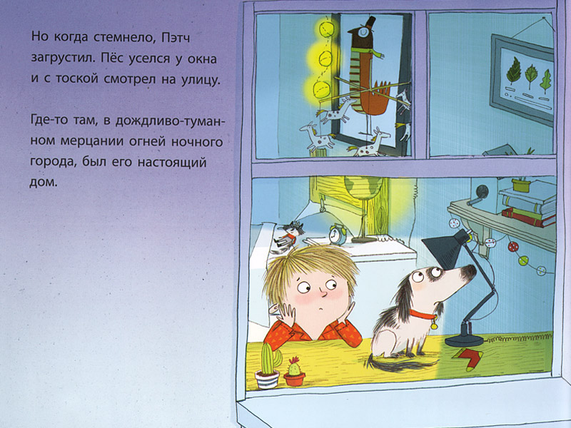 Но идиллия новой дружбы все же зыбкая. На картинке вечер, и Пэтч грустит, глядя в окно. Дети понимают: он скучает по своему прежнему хозяину. Оливер так рад, что нашел друга, но понимает, что нужно совершить Правильный поступок. Слушатели догадываются: Оливер решил вернуть Пэтча. Они напряженно слушают, как мальчик готовит и расклеивает объявления о находке, спрашивает соседей… ‒ но вместе с ним надеются, что хозяин не найдется и друзья останутся вместе. Никто даже не допускает мысли, что может быть по-другому.