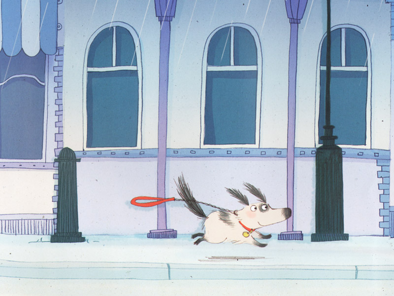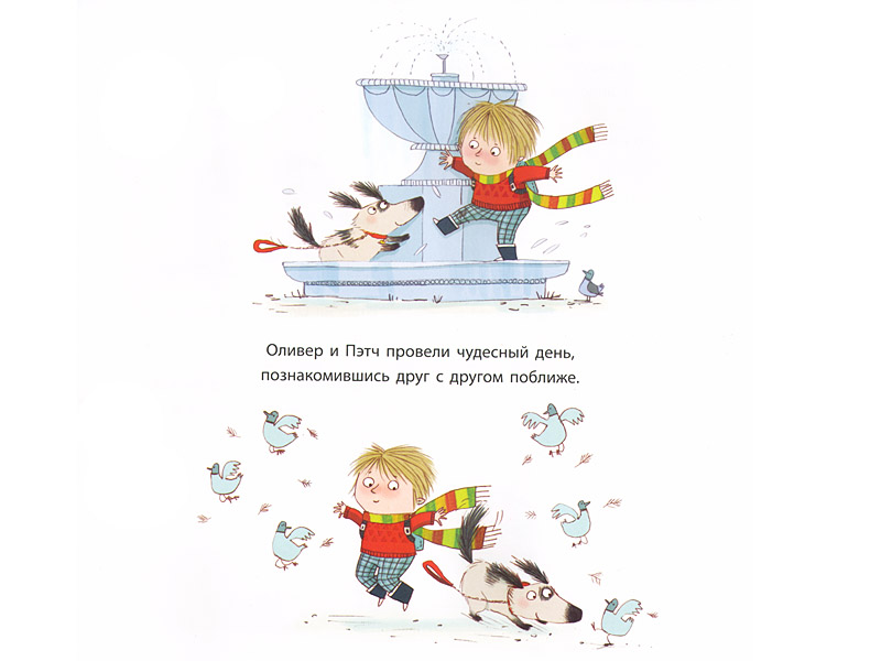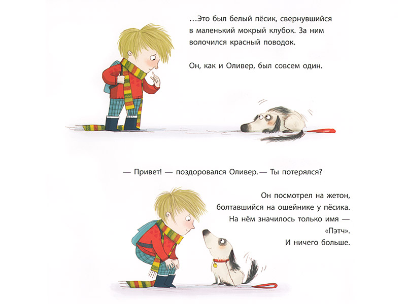Оливер – одинокий мальчик, который недавно переехал из деревни в город. На протяжении все истории мы ни разу не видим рядом с ним ни родителей, ни каких-то еще заинтересованных в нем взрослых: только прохожие, которым нет никакого дела до бесхозного ребенка. Оливер идет по улице и неожиданно видит что-то яркое, как мак. Моим слушателям примерно 5-6 лет, и они уже знают, что мак – это красный цветок. На иллюстрации мы видим несколько красных предметов, но героя привлек поводок. На следующей странице этот поводок приводит его к собаке. Жетон на шее сообщает, что ее зовут Пэтч. Жизнь Оливера радикально меняется: он больше не один!