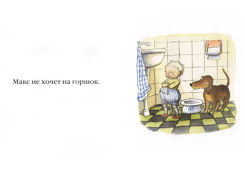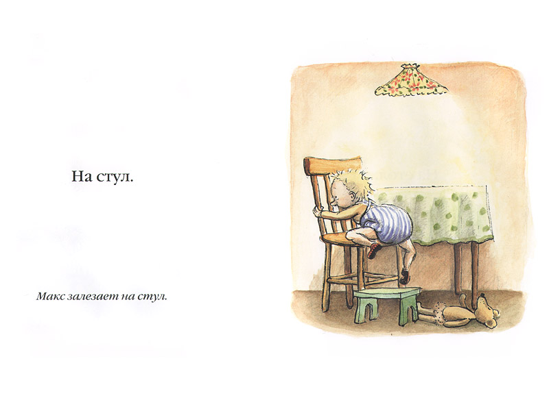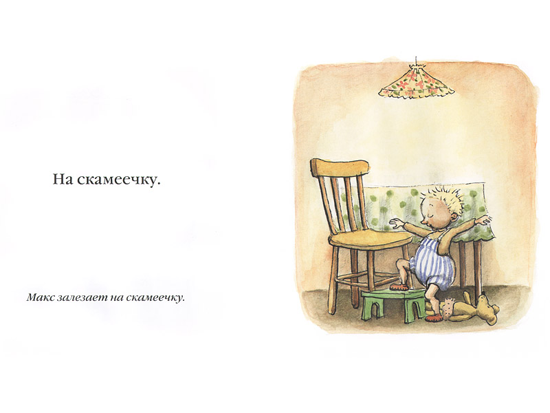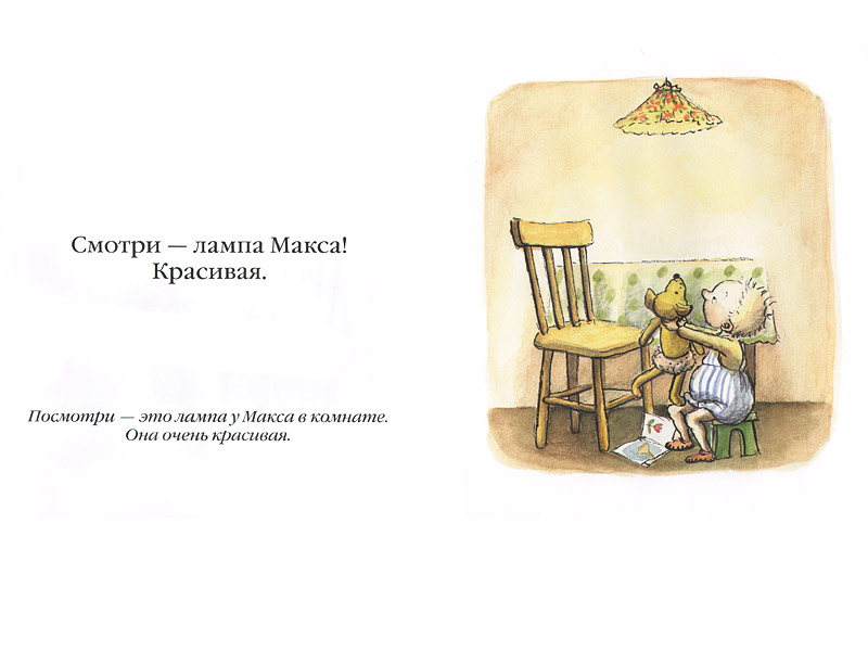Именно о таких повседневных и понятных двух-трехлетнему читателю ситуациях рассказывают, причем имитируя его собственную речь, книги про Макса. В истории «Макс и лампа» примитивный текст для юного читателя даже «переведен» на «взрослый» язык: «Дать лампу. (Макс хочет достать до лампы)». Хотя это явно излишне, и в других книгах все исчерпывается одной строчкой на разворот. Взрослые, которые постоянно общаются с маленьким ребенком, вряд ли нуждаются в таком переводе.