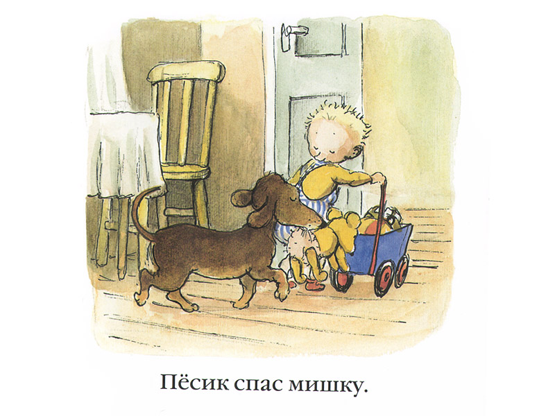В историях про Макса иллюстрации играют ведущую роль. Зачастую картинки рассказывают гораздо больше, чем лаконичный текст-комментарий. Так, в истории про Макса и тележку на одном из разворотов текст говорит: «Песик спас печенье». Но почему же на следующем развороте мы читаем: «Нет печенья», а на картинке у песика такой виноватый вид? Так и слышишь разговор взрослого и маленького читателя: «Куда делось печенье? Ну-ка, где оно? Это песик его съел!»