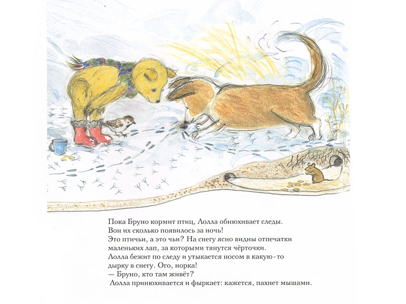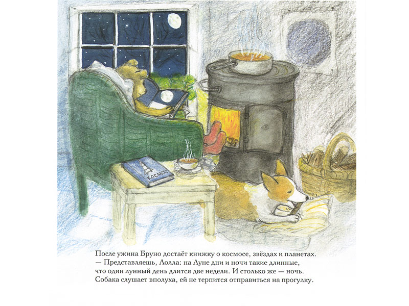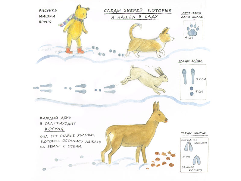 Он даже когда идет купаться или в лес на прогулку, все время наблюдает, замечает (чтобы потом записать в свой дневник), что-то объясняет Лолле. Лолла все-таки собачка! Понятно же, что собачка не может знать всего, что знает умный Бруно (или умный четырехлетний ребенок). И ребенок с полным пониманием следит и за действиями мишки, и за его объяснениями и как бы между делом «заглядывает в глубину вещей»: под опавшие листья, под снег, в какое-нибудь странное углубление в земле, разглядывает маленьких обитателей пруда. А можно еще и небо рассматривать. Там тоже, оказывается, много интересного.