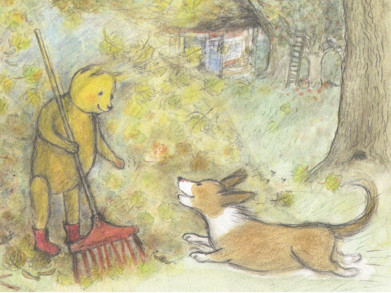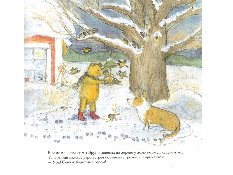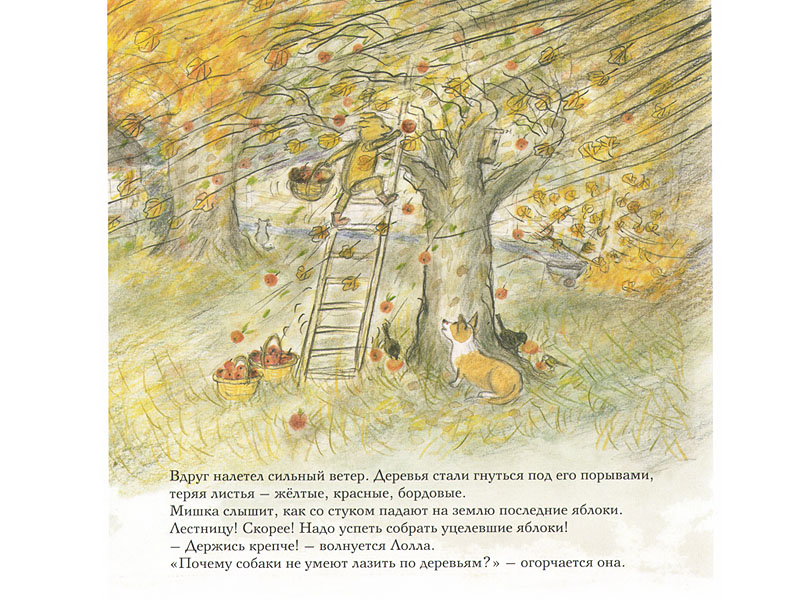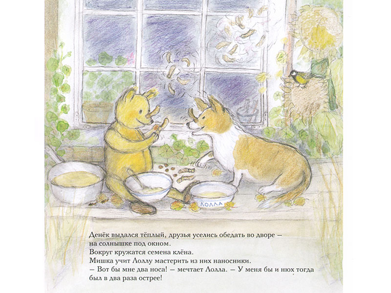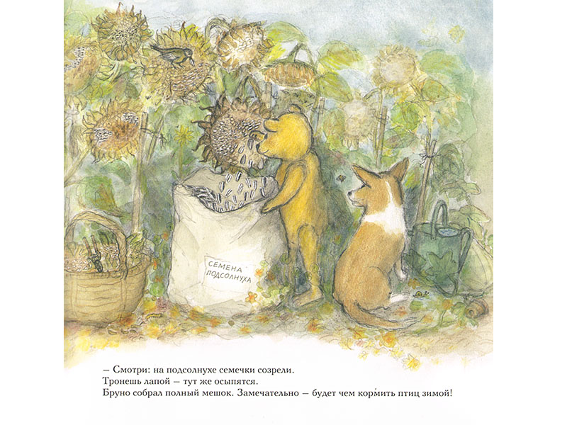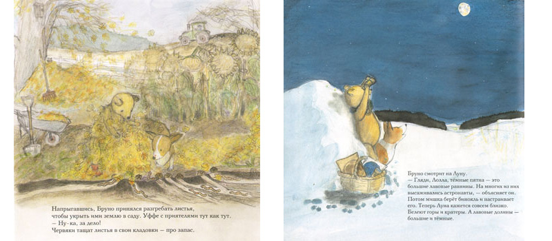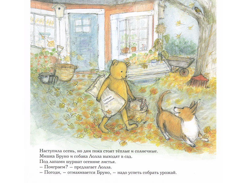 Осенью мишка Бруно собирает урожай, сгребает сухие листья в кучу, сушит яблочные колечки и ведет дневник наблюдений. С ним – его верный друг Лолла. Лолла – собака. Почти настоящая. Она бегает как собака. Ее чистосердечные радости ‒ чисто собачьи. Она тявкает. И хотя Бруно прекрасно ее понимает, все-таки не очень понятно: это интуиция хозяина или действительно «человеческая речь». Но это совершенно не важно. А вот сам мишка – игрушечный. Точнее – «человекообразный». Он ходит как человек, спит в кроватке, занимается человеческими делами и его посещают человеческие мысли. Он и выглядит как традиционный игрушечный медвежонок, который в прошлом веке был обязательным обитателем детской. И он прекрасно вписывается в ряд знаменитых литературных медведей.