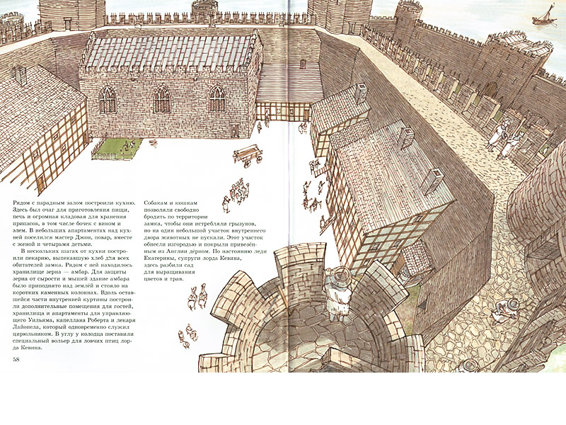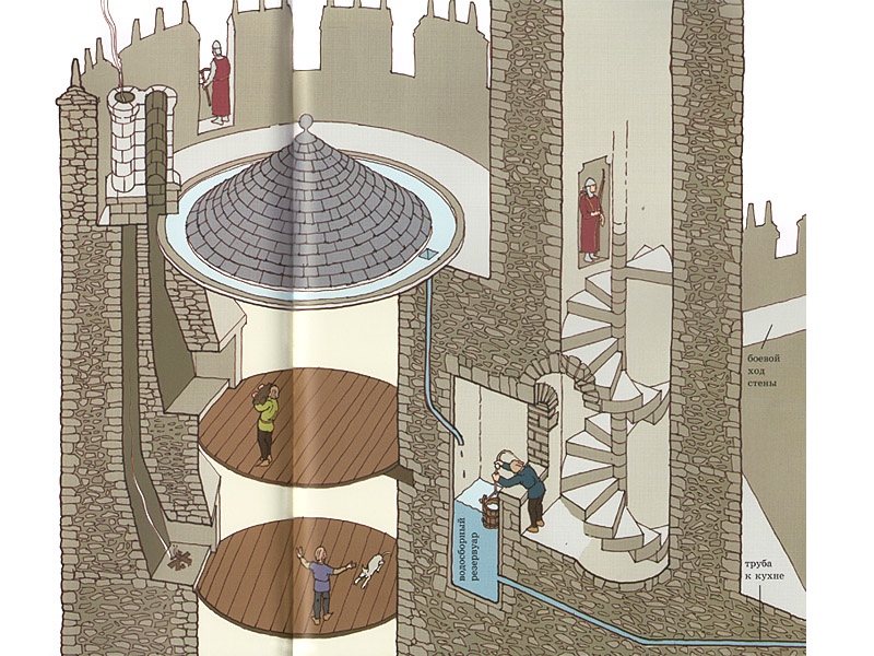 Но книга – совсем не только об архитектуре и технологиях строительства. Очень много внимания уделено людям, работающим на стройке, охраняющим стены, живущим в замке. С помощью иллюстраций Дэвид Маколи рассказывает о строительных профессиях, многие из которых давно уже исчезли, об инструментах, которыми пользовались ремесленники.