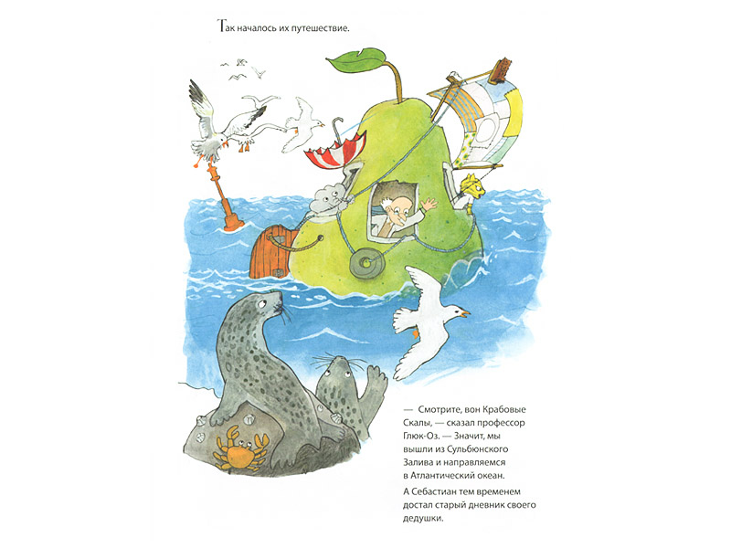 Мне кажется, «Невероятная история о гигантской груше» может служить вдохновляющим примером для маленьких выдумщиков. При этом книгу интересно не только читать, но и рассматривать. Иллюстрации тоже игровые: вот груша посреди моря с наспех сшитым из обрезков ткани парусом, вот Жуткий морской дракон в разрезе, вот родной берег Сульбю в окулярах бинокля.