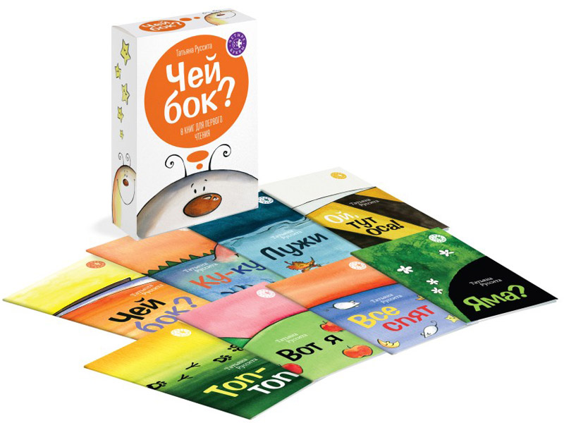 Издательство «Манн, Иванов и Фербер» выпустило набор книжечек «Чей бок?» с подзаголовком «8 книг для первого чтения». По словарному набору и уровню сложности слов это тексты так называемого «букварного уровня»: что-то подобное можно встретить в букваре. Все слова здесь состоят из двух-четырех букв, а предложения – максимум из трех слов (предлоги не считаю).