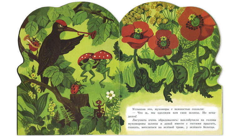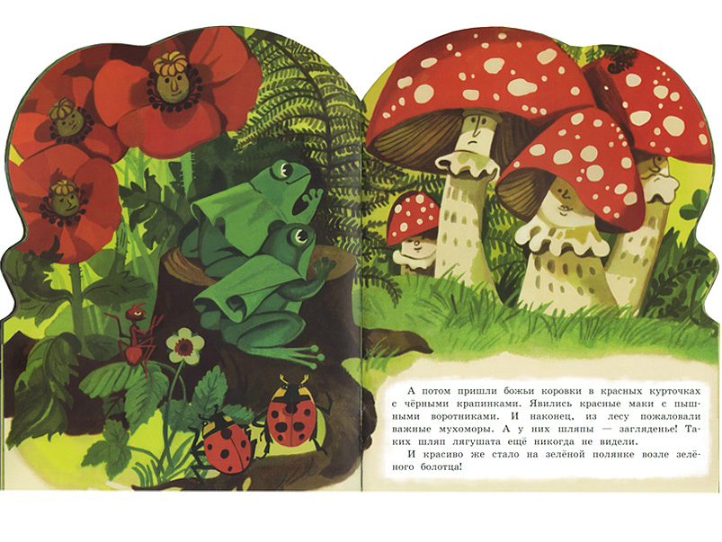 Как любая талантливая книжка для малышей, сказка про лягушат насыщена разного рода познавательным «материалом», причем достаточно серьезным. Тут вам и знакомство с разными представителями животного и растительного мира (дятлы, божьи коровки, маки, мухоморы), и цвет как способ природной защиты, и взаимоотношения природных обитателей, и первые представления о возможных способах классификации (по цвету). И все это самым органичным и логичным образом вплетено в сюжет.