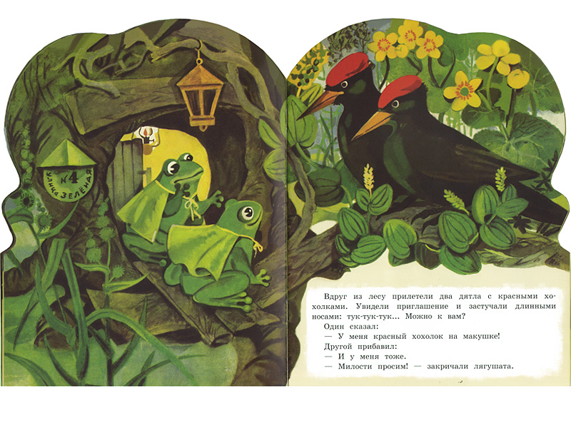 В какой-то момент лягушатам очень по-детски становится скучно: что это всё вокруг такое зеленое? Хотим чего-нибудь новенького! И ведь речь тут не идет о действительном разнообразии. Тут возникает простейшая альтернатива: было зеленое – а мы хотим красного. Это так называемая «дуальная оппозиция», простое противопоставление – первый шажок в овладении мыслительными операциями. И то, что лягушата предпочитают красное зеленому, ребенку очень понятно. Красный – первый цвет, который малыш начинает выделять как цвет. Трудно сказать, почему именно. Возможно, в силу его яркости. Возможно, потому что это обусловлено тысячелетиями природной памяти, характерной не только для людей: красный – важный сигнал опасности. Собственно, в сказке это и обыгрывается: лягушата, надевая красные шляпки, играют с опасностью, хотя поначалу и не понимают этого. Они безрассудно «экспериментируют» – вопреки предупреждениям старой жабы (такой символ родительского консерватизма). Никакие разумные предупреждения не работают: лягушата в своих «экспериментах» должны дойти до той грани, когда их поведение угрожает их жизни. Тут они, к счастью, спохватываются и следуют спасительному совету жабы – сбрасывают красные шляпки. Видимо, надо слушаться? Старая мудрая жаба оказалась права?
