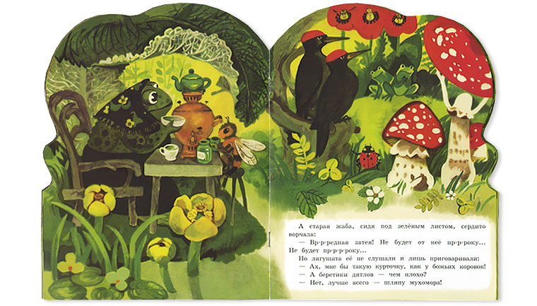 Все, включая картинки. Картинки – внятные, крупные, без излишней «зашумленности», без лишних деталей. Самое главное – это «мордочки» персонажей и их характерные «черты». Некоторые картинки – прямо как «визитные карточки» персонажей, появляющихся по мере развития сказки. Например, в тексте говорится: «Прилетели два дятла с красными хохолками». И мы видим этих дятлов ‒ крупных, «цельных», в ярких красных шапочках. В тексте говорится: «Явились красные маки с пышными воротниками» – и на картинке нарисованы маки, а их венчики – точь-в-точь воротники. Старая жаба напоминает бабушку или няню, и в то же время – какую-то «народную знахарку». Вот она, в большом платке, за самоваром, и потом – на последней странице, такая вся темно-зеленая, «укорененная», одобряющая «исправившихся» лягушат.