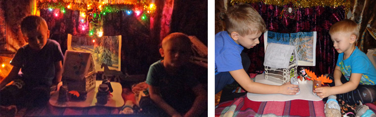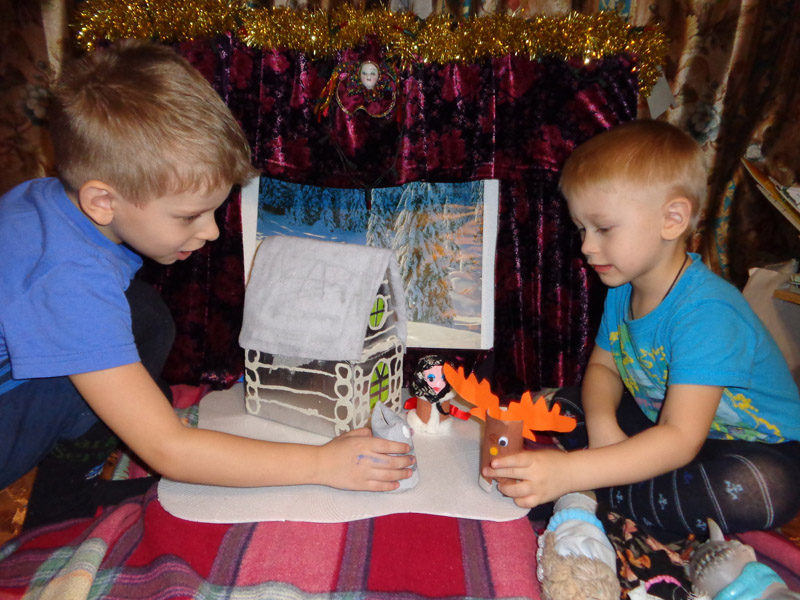 Семью многодетного горюна изображали куклы, оставшиеся от спектакля «Морозко», но можно и просто их нарисовать.