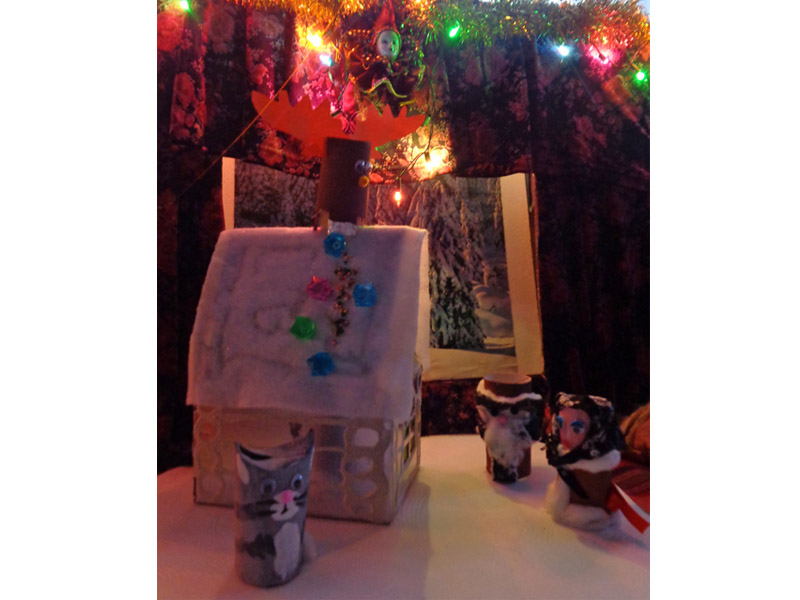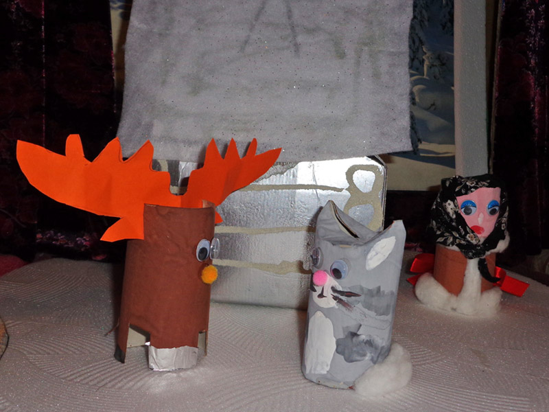 Кокованю Саша сделал из ваты, раскрасил гуашью и наклеил опушку тулупа и шапки и бороду. Даренке из той же ваты сделал косу, прикрепил бантик из узенькой ленточки и повязал (с моей помощью) лоскуток-платочек. Над кошкой Муренкой пришлось поколдовать и мне: загнуть края рулончика внутрь, чтоб получились ушки на макушке. А дальше, как и у всех: белая грудка и полоски нарисованы, хвост из ваты наклеен. Серебряное копытце украсили ветвистыми рожками, которые вставили в прорези в верхнем крае рулончика, а по низу сделали 4 выемки, чтобы обозначить ножки. На правую переднюю ножку Сашка наклеил серебряное копытце из полоски фольги.