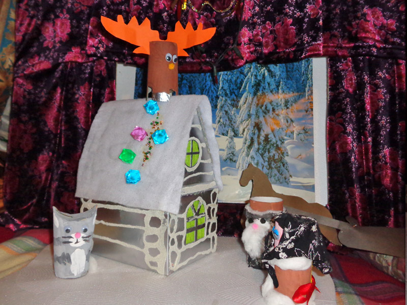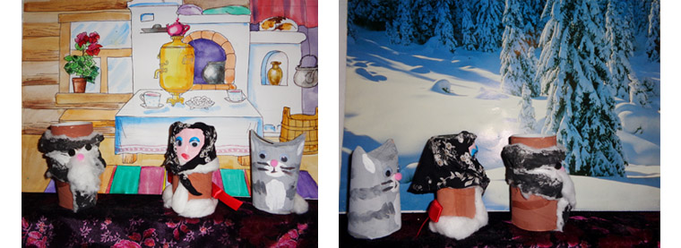 Декорации у нас уже были от других спектаклей: старый дом, доставшийся горюну с семьей, остался от «Колобка», изба Коковани - от «Курочки Рябы», заснеженный лес - от сказки «Морозко», поэтому нужно было сделать только пейзаж деревенской улицы, балаган да самих героев.