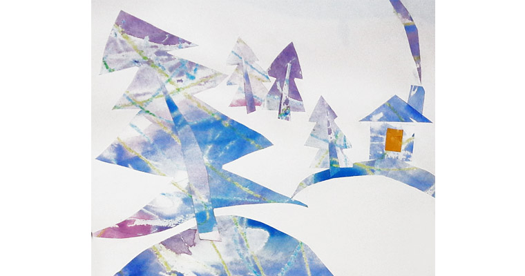 Для создания деревенской улицы мы выбрали технику аппликации: раскрасили восковыми мелками лист А3 и акварельными красками холодных оттенков. Затем вырезали детали сугробов, елок и домиков. Все расположили на другом листе того же размера и наклеили. Окошки сделали из желтой бумаги.