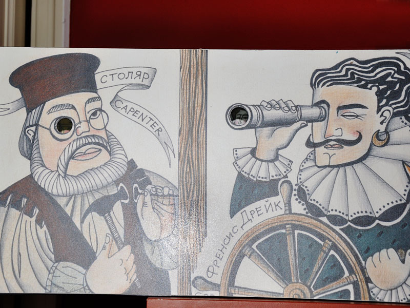 Мы начали думать про киску, которая «при дворе видала мышку на ковре», и в какой-то момент я понял, что здесь спрятана серьезнейшая философская идея: человек видит только то, что он способен увидеть. В результате мы сделали модуль в виде ящика с окошками: поочередно заглядывая в них, можно увидеть ‒ на картинке, расположенной напротив окошек, ‒ только те детали интерьера, которые заметил бы конкретный персонаж. Что первым делом увидел бы трубочист? Естественно, камин. Что увидел бы мореплаватель сэр Фрэнсис Дрейк? Он служит королеве, поэтому увидел бы, конечно, саму королеву. Что увидел бы столяр? Безусловно, деревянный трон королевы. А что увидела бы киска?..