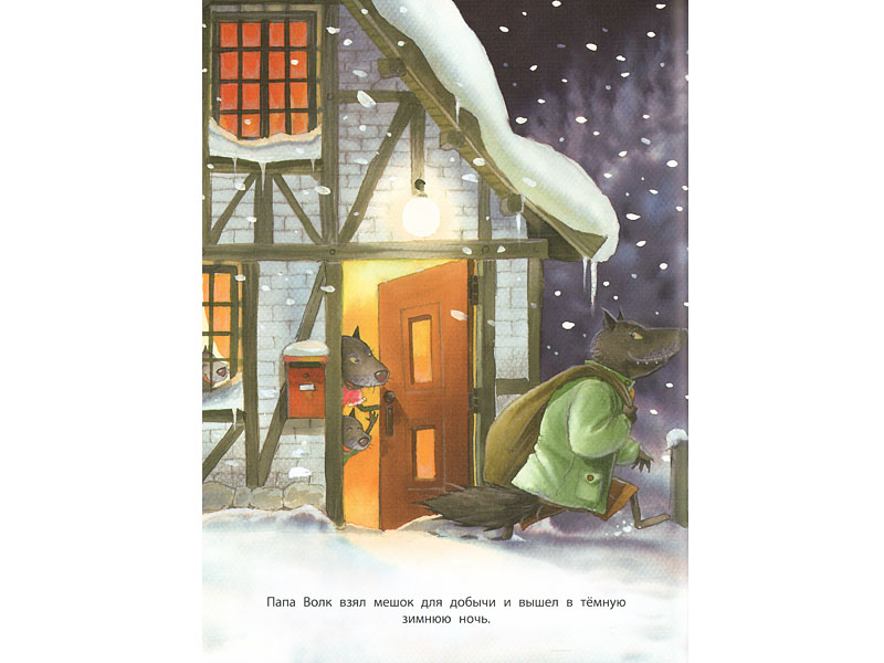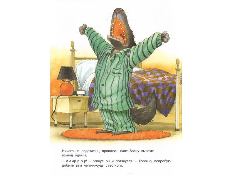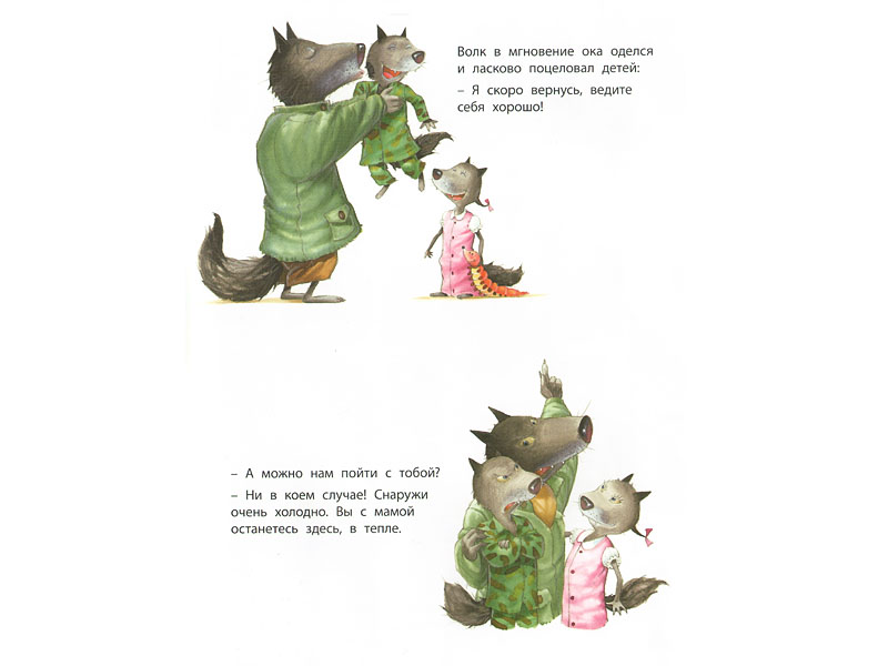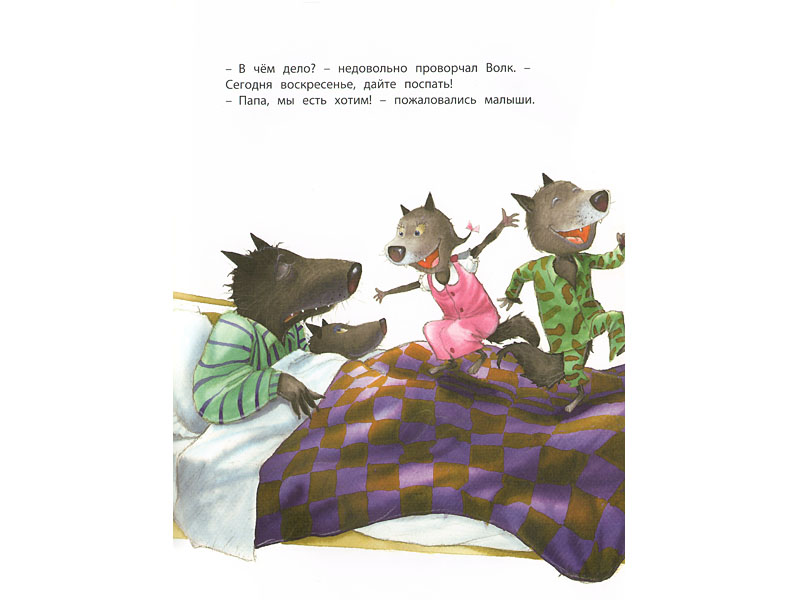Конечно, малышам трех-четырех лет тонкая ирония сказки еще недоступна. Но Волк – образ понятный. То, что Волк – папа и у него есть детки-волчата (вызывающие симпатию), изменяет ракурс восприятия в положительную сторону. Волк хочет кого-то съесть? Понятно. Волк отказывается от этого? Похвально. Малыш должен быть доволен этим обстоятельством. Волк делится со своими несостоявшимися жертвами сладостями? Молодец Волк. Так и надо себя вести. И в целом, с точки зрения маленького ребенка, у сказки хороший конец. Об этом свидетельствует стол, заваленный разными хлебобулочными вкусностями. Единственное, что может малышу не понравиться, это угрожающая поза Волка, нависшего над столом. Но зато как довольны волчата и волчиха (больше похожая на модель из модного журнала ‒ по крайней мере глаза у нее подкрашены синей тушью)! И можно (наверное, нужно) сказать ребенку, что Волк только притворяется злым. А на самом деле он какой? Добрый.