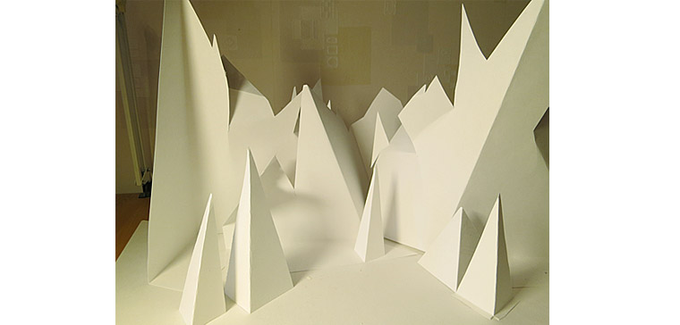 В середине нижнего края листа сделаем наклонный надрез (или надрезы) длиной около 10 см. От конечной точки надрезов по предварительно намеченным линиям сделаем сгибы. Из обрезков таким же способом сделаем «мелкие льдинки» (рис.3). Нижние края, отогнутые в противоположные стороны, придадут деталям устойчивость. Детали расположим на большом белом листе, не приклеивая (рис.4). В процессе театрального действия их можно будет передвигать.