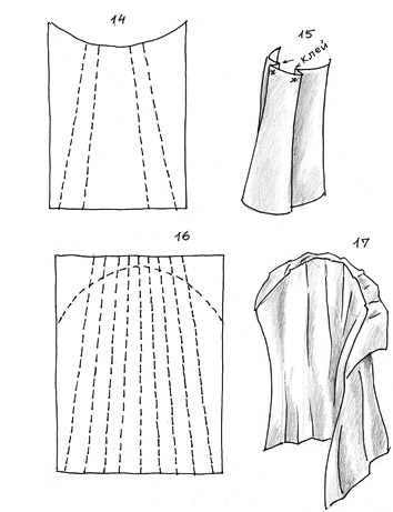 По рисунку 14 срежем верхний край листа по дуге (центр дуги должен находиться на уровне груди фигуры). Расчертим линии, выполним сгибы (рис.15) и заклеим складки наверху.