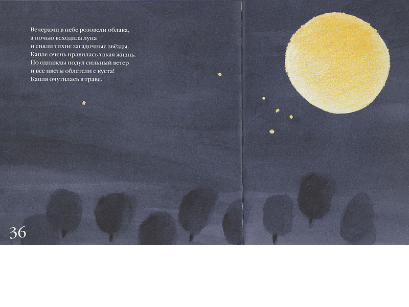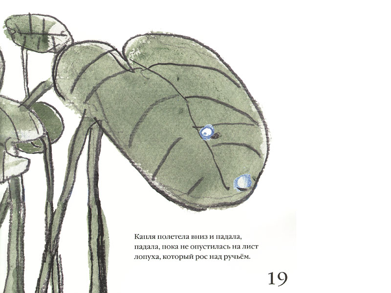 Капля летит по небу, собирается с другими каплями в облако, падает на землю с дождем, живет в ручье и в ведре с водой, в соке цветка, в тумане, выпадает росой, становится снежинкой… Каждое превращение для нее неожиданность, но единственное, чего боится Капля, – быть съеденной.