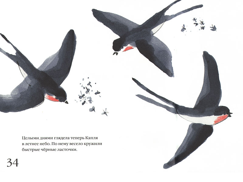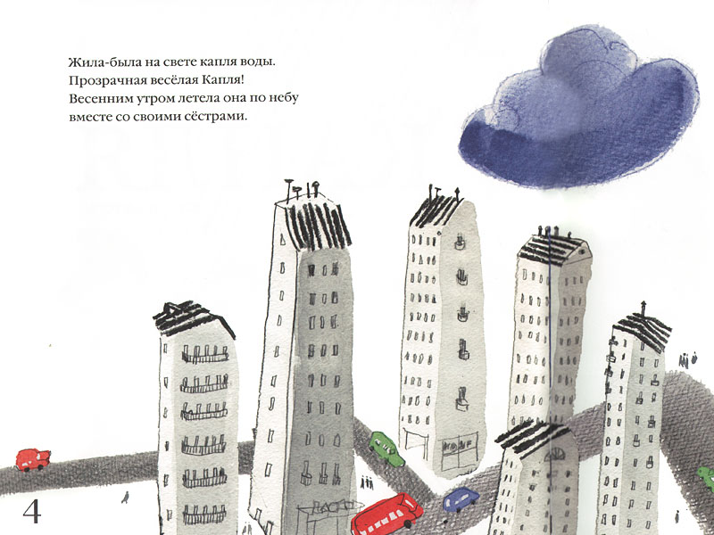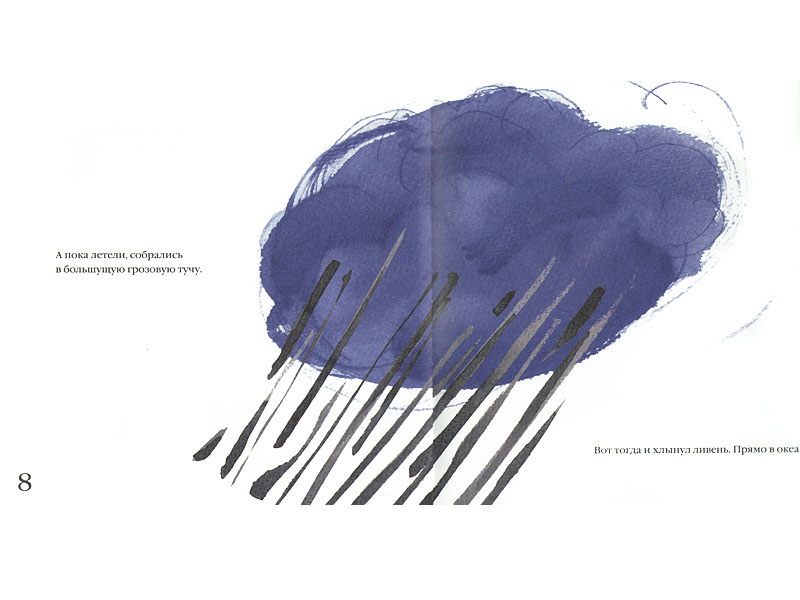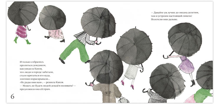 За каждой фразой этой короткой сказки кроется множество вопросов. Вот летели капли над городом («Летели? И не падали? Почему? А они не дождь?..»), увидели, что люди им не рады, и не стали проливаться на них дождем, полетели к океану. А что будет, если капли совсем не станут поливать людей? А поля и леса? Если будут только над океаном ливни устраивать? И как им туда долететь, если океан далеко? Но почему вообще капли решили, что люди им не рады? На рисунке ‒ одни черные зонты, и только ноги торопливые из-под них видны. Похоже, люди и правда не рады. Ни у одного ребенка, наверное, нет черного зонта, но нарисуй автор цветные зонтики, может, капли полетели бы к ним, и история была бы другой.