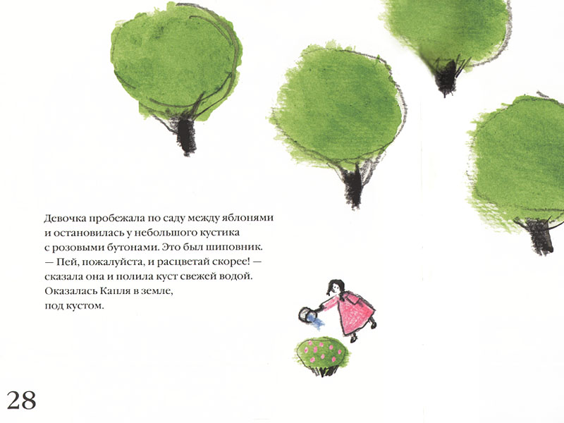 Объединяет эти миры Сказочник, который объясняет Капле, зачем она нужна. Его непривычное обращение: «Здравствуй, Снежинка!» – заставляет ее задуматься о том, кто она, и оглянуться на пройденный путь. Сказочник вносит в простую историю элемент рефлексии и дидактики: «Ты – Капля Воды, и ты везде нужна. Без тебя всё в мире остановится». Такое взрослое послание-объяснение, выстраивающее всю историю: после этого остается лишь обсудить с ребенком, зачем нужна капля и что без нее остановится. Это практический взгляд на мир. А поэтическая энергия истории побудит после этого видеть капли (Капли) везде, так что не удивляйтесь, если после этой книжки ребенок будет здороваться с каплями и разговаривать с ними, где бы он их ни встретил.