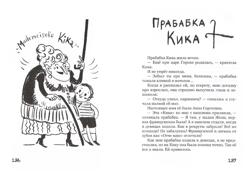 Мать воспитывает, ведет за руку к турникетам (а в них монстры!), а то в Мавзолей (а там мертвяки!). Отец ‒ ученый, он вечно занят, но время от времени вовлекается матерью в «воспитательный процесс»: «Борь, ну как это? Ну вот спроси его: “Саша, где штаны?” – Лидочка, ну ты же спросила». Дворник Фарид ходит по двору со шлангом, «училка» стучит указкой по столу. Они статичны и в мир «толстого мальчика» не вхожи. А еще они ненадежные: «Умирают, постоянно. Один за другим». Совсем иное – дети и вышедшие за пределы обыденной взрослой жизни бабки и деды: великолепная «прабабка Кика» – мадемуазель Кика, дед Петр. Одной лет и не сосчитать сколько, она знает, как раньше жили, «когда все по правилам было», и правнука, шалопая любимого, учит. Дед сеансы спиритизма устраивает, раз в неделю превращает внука в кого угодно, а по весне часто умирает. Когда они действительно умирают, то не уходят в пустоту, внук не теряет их, «его мертвецы и ангелы» по-прежнему покровительствуют ему, приглядывают за ним, непутевым, поучают и ждут, «место греют».