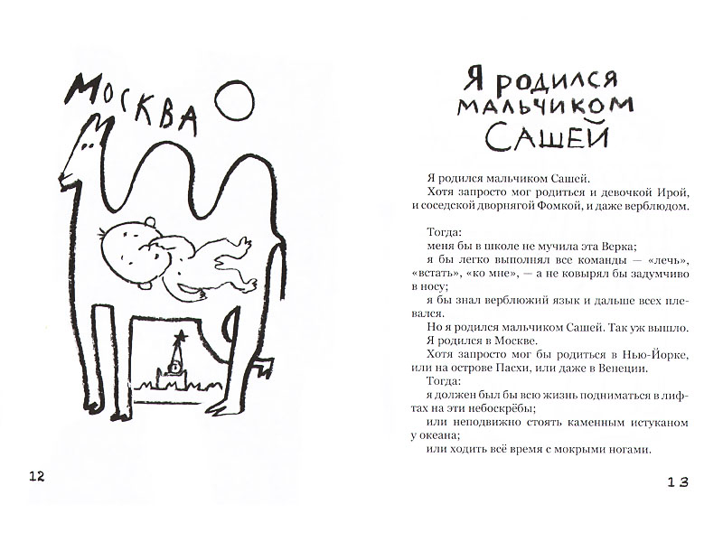Внешне ему все как с гуся вода. Воспитательница кричит ему: «Встать в строй! Шагом марш!» А он в этот момент – мальчик-собака или мальчик-тюлень. С точки зрения взрослых, он не слышит, но под «защитным слоем» жизнь кипит, все летит и вертится – герой вбирает в себя увиденное-услышанное, трансформирует его, переваривает, отторгает, боится, мечтает, болтает с игрушечным Буратино... Он счастлив. Первые две части книги так и называются: «Московские счастья (жизнь до метра)» и «Московские счастья (жизнь после ста сантиметров)». Но сколько в этих «счастьях» иронии и даже жестокости, принуждения, которым полнится детская жизнь. Почти каждый рассказ о мучении, если по-честному. И о счастье. Такой парадокс восприятия.