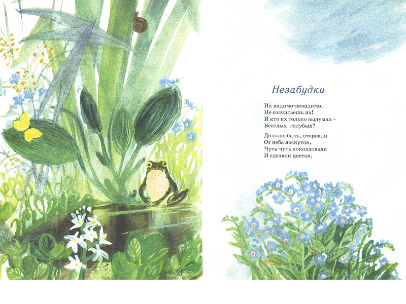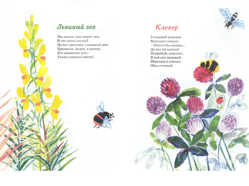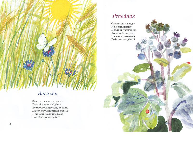 Большая редкость, когда книга для малышей получается такой цельной и глубокой. Книга о цветах, но за ними – «большая природа», сама жизнь. Бабочка-белянка спряталась под зонтиком борщевика. А дальше – радуга в просветлевшем небе и размытая, уходящая вдаль дорога.