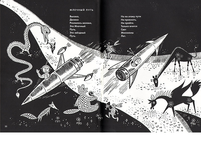 Иллюстрации в «Звездной карусели» черно-белые. Даже не просто черно-белые, а скорее черно-черно-белые ‒ так уверенно и ярко там присутствует черный цвет. Такое не часто случается в детских книгах. В нашей домашней коллекции это только, пожалуй, «Сказки для тех, кому еще нет трех лет» Эжена Ионеско с иллюстрациями Александра Райхштейна и старая «самокатовская» книга «Простая бандероль» Брюно Хейтца: иллюстрации в ней – условно-грубоватые линогравюры, цветные, но черный цвет там явно самый главный, ведь это цвет главного героя. А еще «Петя и волк» Сергея Прокофьева с иллюстрациями Франца Хаакена, в ней все герои, нарисованные тонкими белыми штрихами, живут на черном фоне.