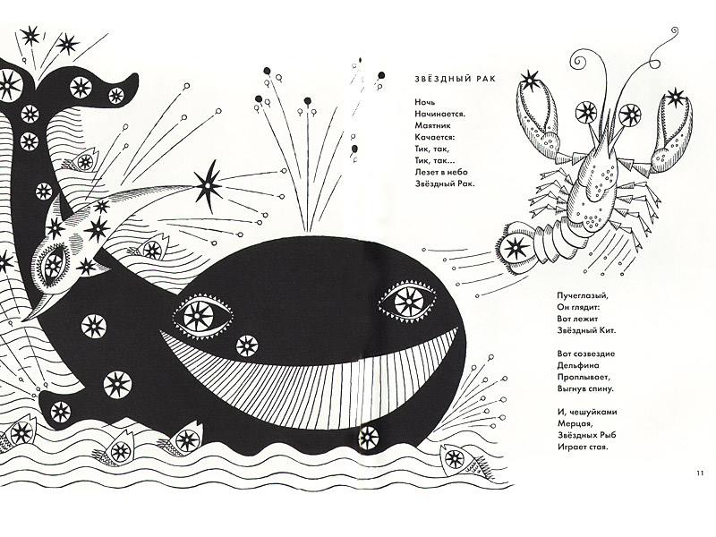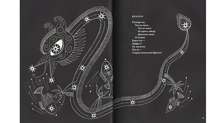 Потом я удивлялась тому, как бесстрашный боец с воображаемыми черепашками ниндзя и супергероями искренне пугался нарисованного дракона – в книге несколько раз заходит речь о созвездии Дракона, и он у Стацинского такой, что действительно можно испугаться: слепит своими глазами-звездами, устрашает острой разинутой пастью с раздвоенным языком. Он изгибается на черном фоне, занимает весь разворот ‒ в общем, изображен именно таким, как его описал Сапгир: «Старый сказочный Дракон».