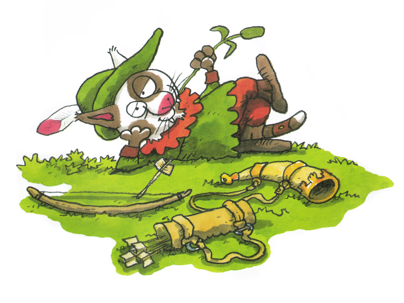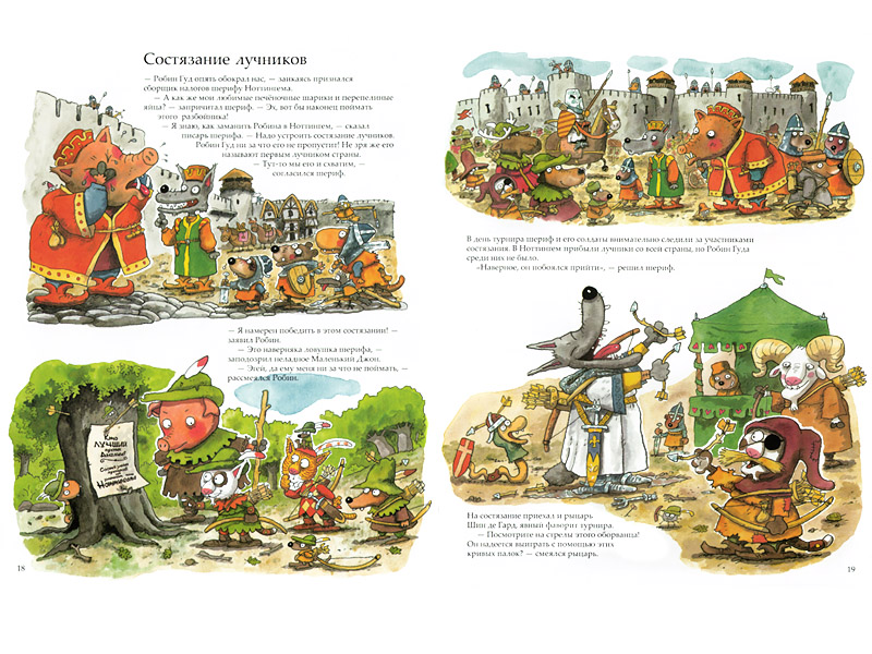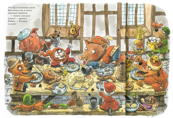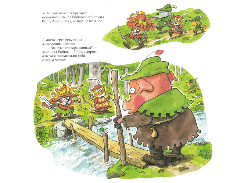 В книжке Куннаса всего восемь коротких историй и в каждой, как и на картинках, найдется немало забавных подробностей, вроде зовущей разбойников обедать леди Мэрион. Золотой посудой бедная вдова и ее дети прикрываются от дождя, а дровосек работает в лесу в рыцарском шлеме. Рассказ о встрече с Маленьким Джоном превращается еще и в историю новой шляпы Робина. От этого смешного подарка монахинь Маленький Джон оставил одни лохмотья. «Ну и хорошо, ‒ обрадовался Робин. ‒ Значит, и носить ее больше не надо».