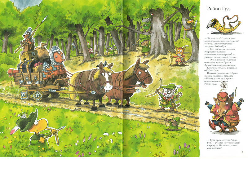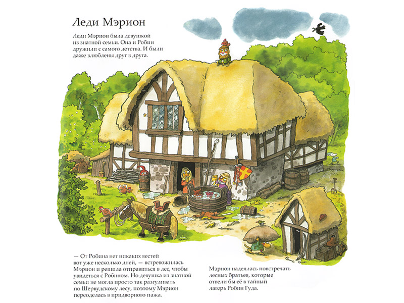 Пока Ира рассматривала картинки, читала сама и время от времени просила почитать меня, незаметно для нее произошло важное событие: легендарная история локализовалась во времени и пространстве. Прежде Робин Гуд был для нее совершенно абстрактным персонажем: у ребенка еще нет контекста, чтобы вписать его в историю Англии. Книжки Куннаса, знаменитого среди прочего адаптацией «Калевалы» и исландских саг, как раз готовят почву для этого.