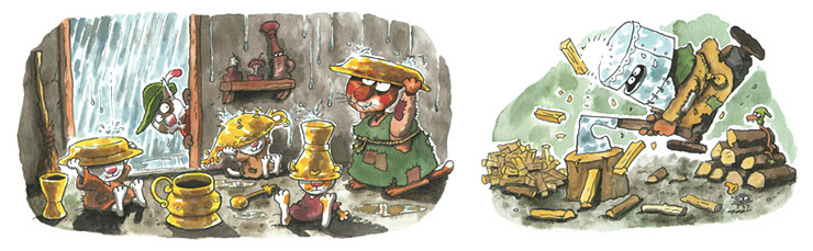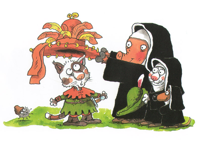 Простой текст (в отличие от стихотворных баллад, которые не во всяком переводе легки для понимания), яркие, полные деталей-деталей-деталей картинки с «фирменными» персонажами Куннаса – антропоморфными зверюшками. Тут и Макс к нам подключился: «А что это кот делает? А куда они стреляют? А почему они с хрюшкой дерутся?.. Ой, смотри-смотри, змея хвостом кувшин держит!» Рисунки Иру тоже заинтересовали и позабавили, а когда она обнаружила, что почти на каждом из них есть козел в ночном колпаке и паучок в одежде, дублирующей наряд одного из персонажей, то потом еще полтора дня играла в «найди лунатика».