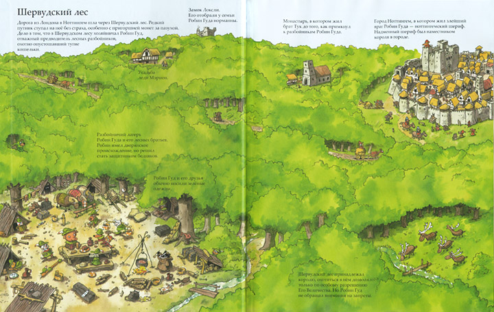 В экспозиции: Шервудский лес, он велик и зелен, как зелена одежда стрелков; замок Локсли, который отобрали у семьи Робин Гуда норманны; разбойничий лагерь; усадьба леди Мэрион; монастырь и город Ноттингем. Да, еще поляна с королевскими оленями. Карта есть. Теперь ‒ «легенда»: «Давным-давно, в 1066 году, норманнские рыцари (потомки викингов, поселившихся на берегах Франции) под предводительством короля Вильгельма Завоевателя напали на Англию. Жителям острова, англосаксам, новые правители совсем не понравились. Завоеватели собирали много налогов и говорили на непонятном французском языке». Дальше описана система власти: король, церковь, наместники. Оговорено бесправие крестьян, принадлежность Робина к англосаксам и его происхождение из знатной семьи. Спорных моментов Куннасы не касаются (тем более что исследователи и сами еще не договорились, когда жил ‒ и жил ли вообще ‒ знаменитый разбойник, а если жил, то как), в книжке воссоздается легенда о благородном стрелке и его соратниках, о жадном и глупом шерифе.