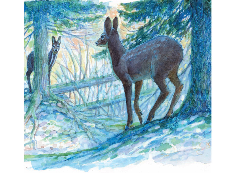 Временами текст казался нам трудным ‒ слишком «охотничьим», что ли, ‒ так много в нем попадалось специфических слов и терминов (вроде «ветровальных елей», «мочажинки» или «схронов»). При первом чтении мне даже остро захотелось, чтобы были сноски, как бывает в учебных текстах и энциклопедиях. Но уже через несколько страниц мы попривыкли, освоились на сахалинской земле и даже научились различать лишайник уснею, которым так любят лакомиться кабарги, и высокую пихту с нежными хвоинками. А еще в списке оленьих лакомств оказались привычные нам и служащие оленям чем-то вроде конфет грибы, ветки ивы и березы, изумрудные листочки папоротника. Знакомое оборачивалось неожиданной стороной, текст захватывал все больше, и сноски оказались ненужными, даже лишними, мешающими вслушиваться в музыку сахалинского леса.